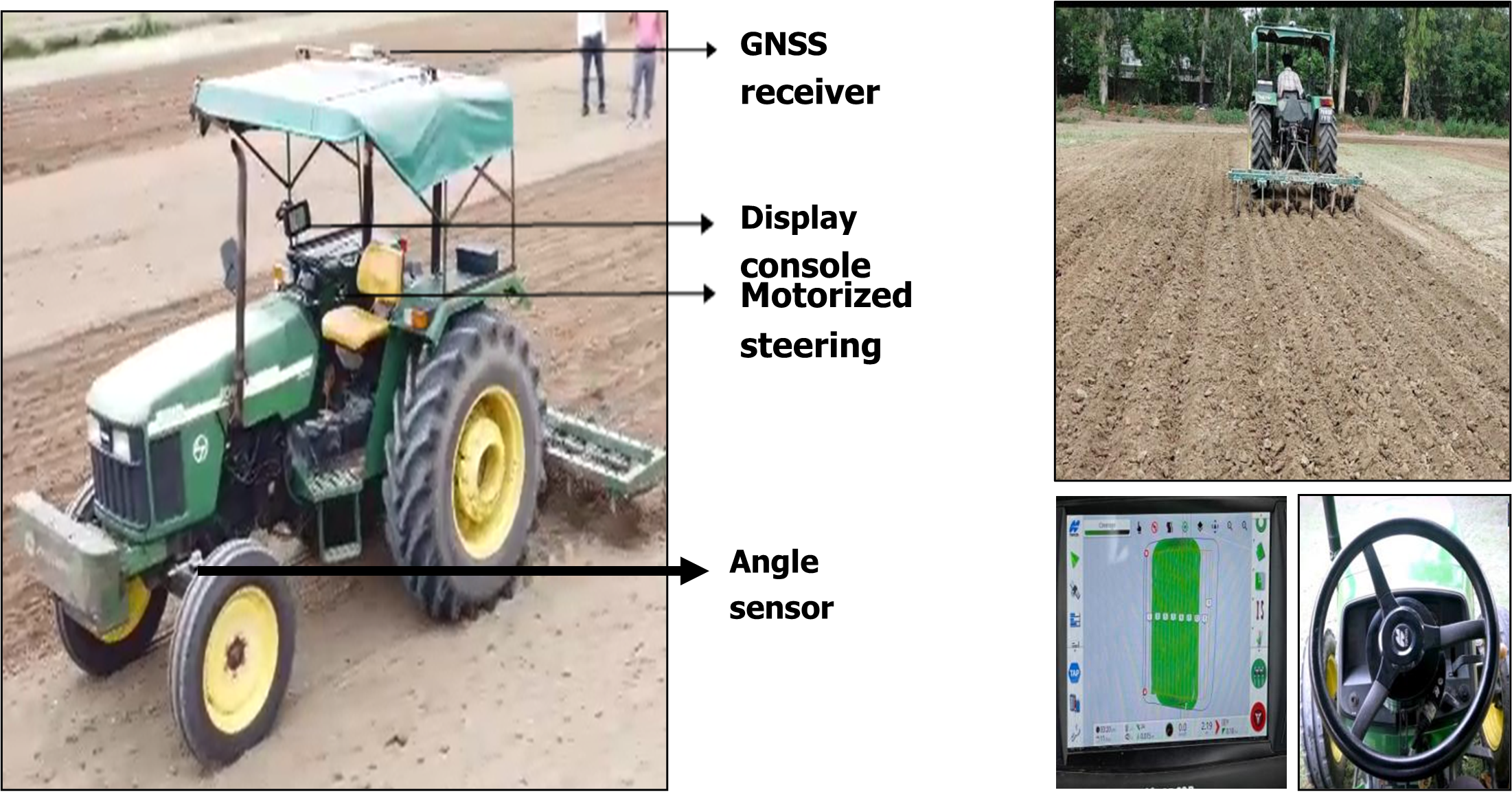 Auto-steering system is a GNSS-based guidance technology to maintain precise steering control, thereby reducing errors caused by manual steering. Auto-steering system helps in operating tractor-mounted implements along a predefined path with enhanced accuracy, reducing missed areas, overlaps, and the number of passes required during field operations. The average overlapped area (in lines), when the tractor was operated with manual steering, was 3-12% for different tillage and seeding machines, whereas with auto-steering system, the average overlapped area was about 1%. Similarly manual steering control, while operating these machines, resulted in missed area (in lines) of 2.0-7.0%, whereas the missed area was less than 1% when the auto-steering system was used to operate these machines. The auto-steering system led to precise work minimal wastage of input resources, enhanced working hours, and improved productivity. The operator’s fatigue also reduced, allowing him to focus on implement management. Further, parallel sowing lines facilitate subsequent mechanical intercultural and harvesting operations.