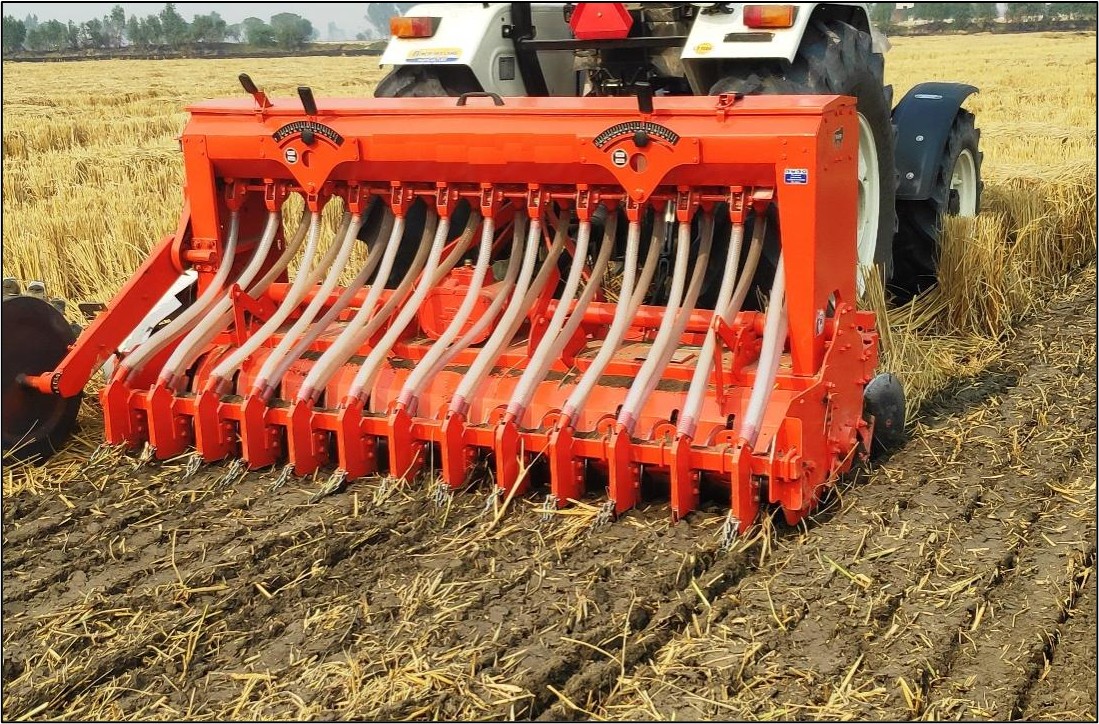 PAU Smart Seeder manages the paddy straw by partial incorporation in a narrow band and retains the remaining straw as surface mulch. PAU Smart Seeder places wheat seeds in a well-tilled narrow band of soil and covers the seed rows with soil, using furrow closing rollers. Tillage in seed rows and furrow closing rollers enhances the soil seed contact and conserves furrow moisture, which results in early and uniform wheat establishment compared to Super Seeder and Happy Seeder. PAU Smart seeder can be operated with a 45 or above hp tractor. The field capacity of the machine is 0.8-1.0 acre/h and the fuel consumption of the machine is 5.0-5.5 l/acre.