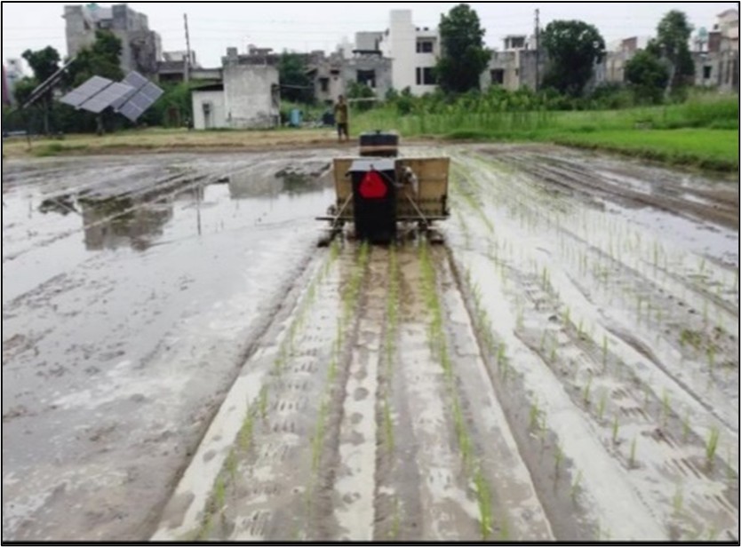 A remotely controlled 2-wheel paddy transplanter was recommended for transplanting mat type nursery. The labour requirement for machine transplanting was reduced by 40%; the effective field capacity of the machine was increased by 10-11% and a net profit increase of 14.25% as compared to the conventional walk-behind paddy transplanter. The physical workload of the operator is also reduced resulting in increased work efficiency with the comfort and safety of the operator without entering in puddled field. The initial cost of the machine with the developed system has been increased up to 28%.