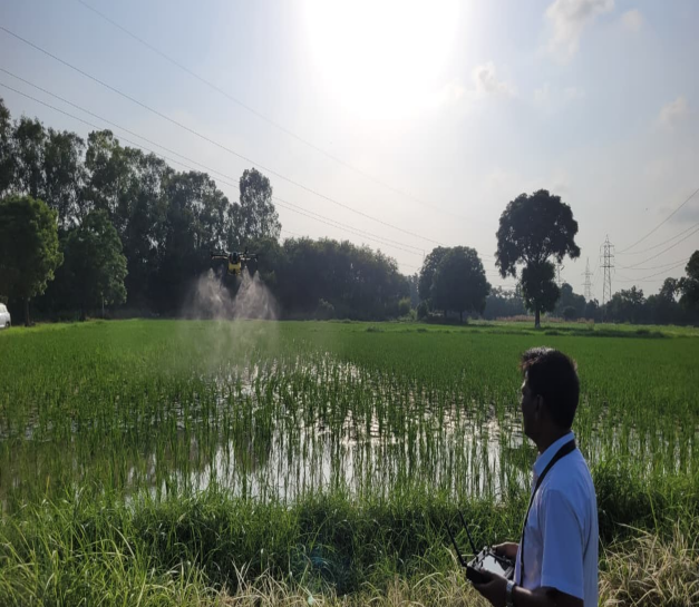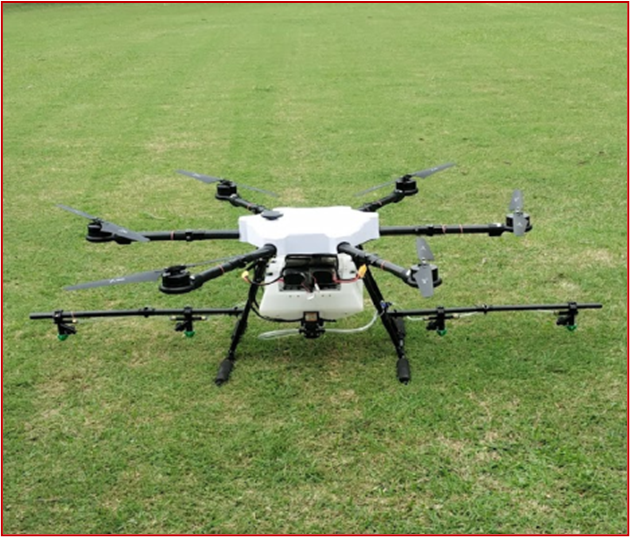 For spraying, a hexacopter drone fitted with a standard/extended flat fan nozzle or anti-drift/air induction nozzles can be used for spraying. The drone can be operated at a forward speed of 2.0-3.0 m/s and height of 2-3 m from the top of the crop and a pressure of 1.38 kg/cm2. Drone/UAV can be used for spraying in all crops especially good for tall crops at all the growth stages of the crops. A certified and trained pilot is required or mandatory for the operation of UAVs/drones in the fields. The total cost of the operation of a drone for spraying will be Rs. 889.7/h or Rs 296.6/acre.