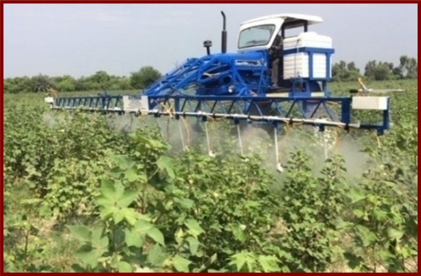 This sprayer has three types of spraying arrangements, namely auto-rotate gun, boom type and drop-up type nozzles, which were operated by a single pump. The pump can be operated at 800 rpm to develop the desired pressure up to 35 kg/cm2. Boom and drop-up nozzle mechanism consists of 14 nozzles on the boom and 13 drop-up nozzles (Make: Teejet) mounted on a foldable 9.8 m wide boom with 67.5 cm nozzle spacing. Boom nozzles were used to spray on the top side of the plant canopy, and other drop-up nozzles were used to spray inside the crop canopy up to 65-75 cm below the boom and within the row or the underside of the leaf through an adjustable drop-up arrangement of the nozzle to target whitefly residing locations. The height of the boom can be adjusted in the range of 30-250 cm according to the crop height.