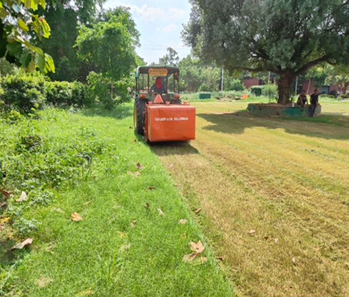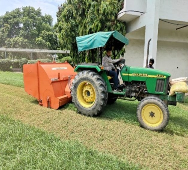 The tractor-operated Turf Manager is a PTO-driven machine designed for simultaneously cutting and collecting the grass. The machine consists of high performance rotor mechanism with multiple flail blades that trim grass and plant residues while generating airflow to transport the material into a rear mounted collection hopper. The field capacity of the PAU turf manager ranges from 0.2 to 0.3 ha/h. The fuel consumption varied from 12 to 20 l/ha, depending on intensity of grass in the field. The quantity of grass collected during evaluation of machine varied from 0.3 to 0.7 t/h. The collecting hopper can hold grass up to 200 kg. The integrated hydraulic system allows easy dumping of the collected material into the field.