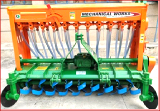 It is a tractor mounted machine for direct sowing of wheat in combine harvested paddy field. The machine is a combination of Roto broadcaster (Roto seed drill) and disc type seeding attachment. The machine consisted of a straw managing rotor for incorporation of paddy straw and a seeding unit for sowing wheat directly after combine harvesting. Seed and fertilizer tubes are opened at the rear of the discs. The furrow opener discs are powered. The shape of the blade is C-J type. The machine is operated by a 55 hp or above tractor. The field capacity of the machine is 0.22-0.27 ha/h with fuel consumption of 8-9 l/h.