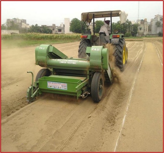 PAU Surface Seeder comprises of straw cutter-cum-spreader fitted with seed and fertilizer box attachment. This machine can be easily operated by a 40 hp tractor or above. It is a low-cost machine that does uniform application of wheat seed & and basal fertilizer along with cutting & and spreading of paddy straw in a single operation. It is followed by irrigation for initiating the germination of wheat.