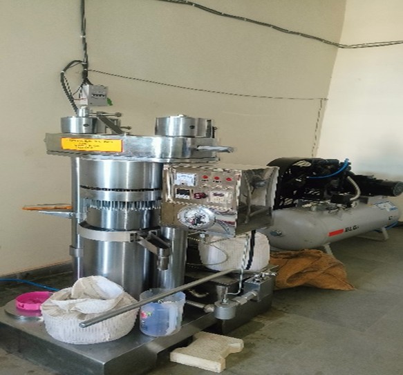 This machine is quite useful in extraction of oil from oil seed crops such as mustard, canola, groundnut and sunflower etc. under low temperature and high pressure conditions. These conditions help in maintain the quality of oil as well as oil seed cake. Most of the oil present in the oilseed can be extracted and a very small amount of oil remains in the deoiled material. There is no need to filter the oil obtained from this unit. The capacity of this machine is about 25 kg/hr. (Figure 4)