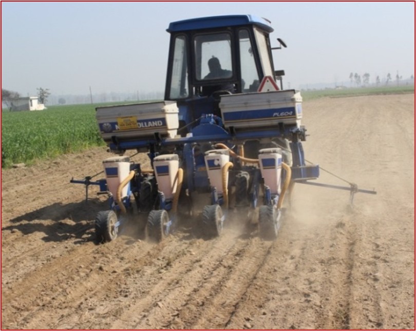 A pneumatic planter uses air pressure to precisely place seeds in the soil. It utilizes either vacuum or positive air pressure to control seed flow, ensuring accurate spacing and depth, which leads to improved germination and higher yields. It drops one seed at a time. There was found no missing/doubling and results in the saving of costly seed. No Damage to the seed was observed during the sowing operation.